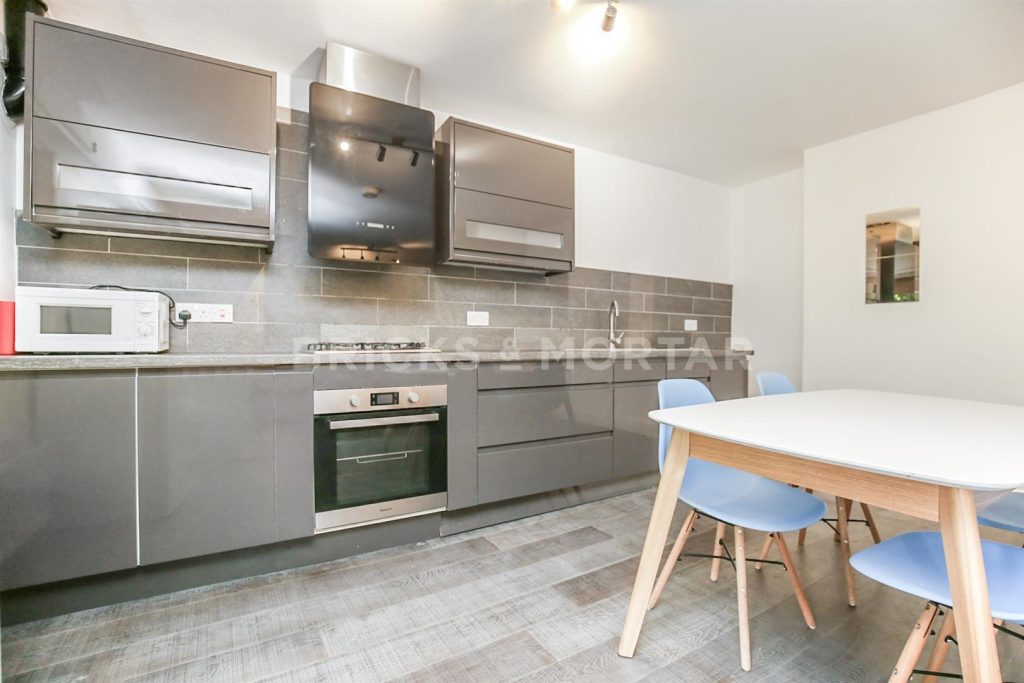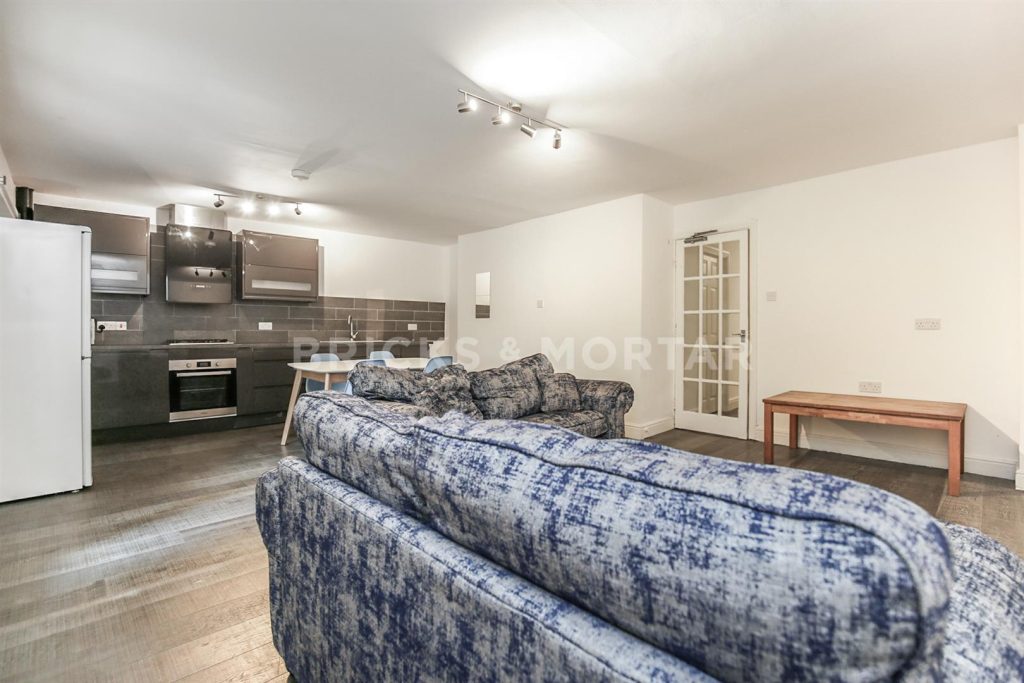 The apartment features a modern kitchen and living area with a sleek, contemporary design. The fitted kitchen comes with integrated appliances, while the living space provides a comfortable setting for relaxing, socialising, or studying with friends.