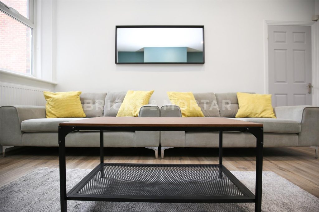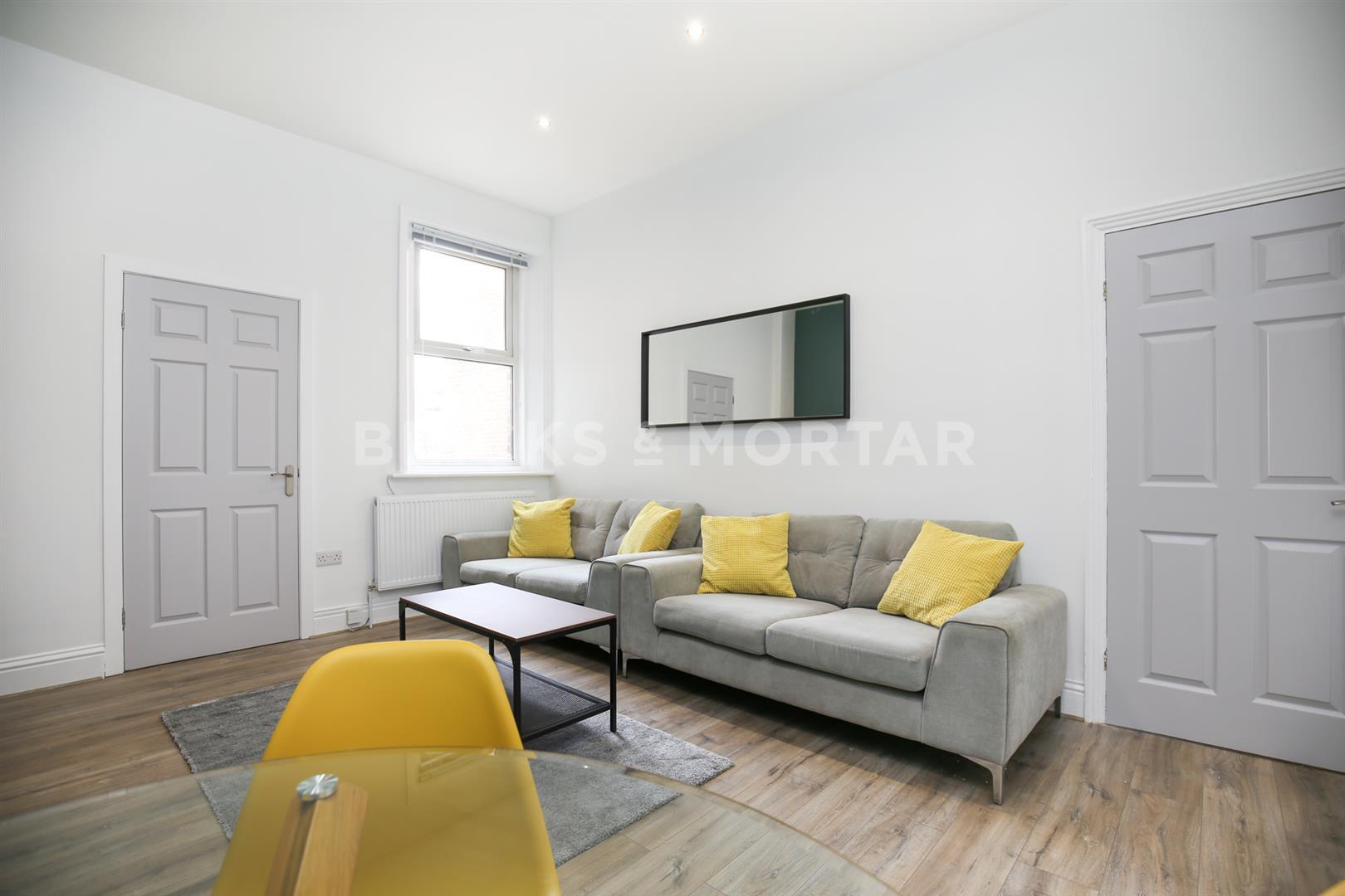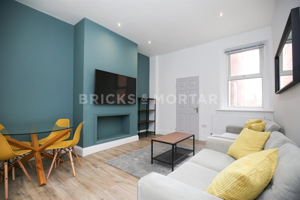 The living space is light, bright and accommodates two beautiful sofas, huge wall mounted TV with feature chimney breast wall, complimenting industrial and wooden display unit and coffee table along with a glass dining table and chairs. The kitchen is fully integrated with sleek, stone coloured units, quirky blue splashback and integral appliances with access to a private rear yard.