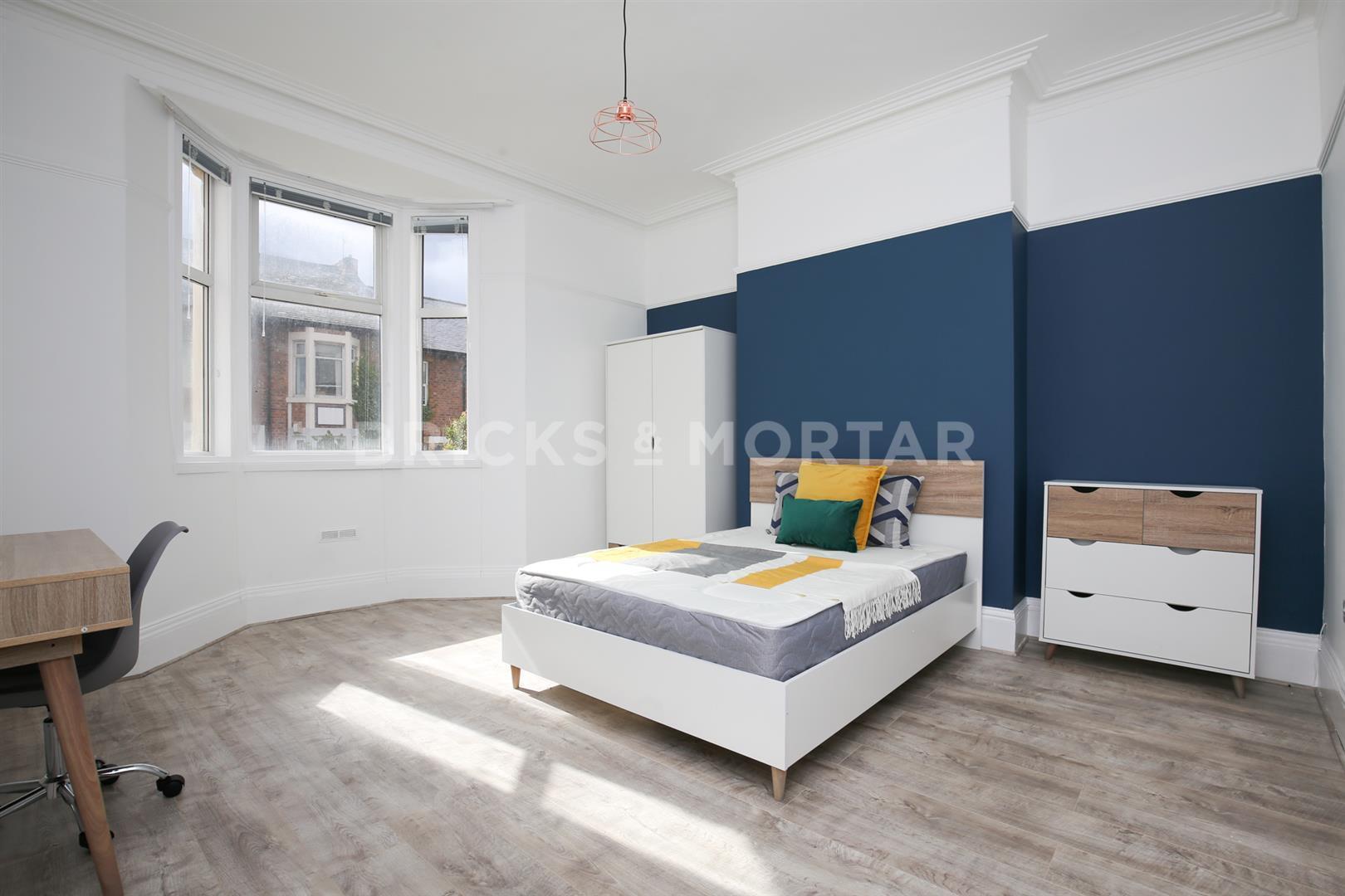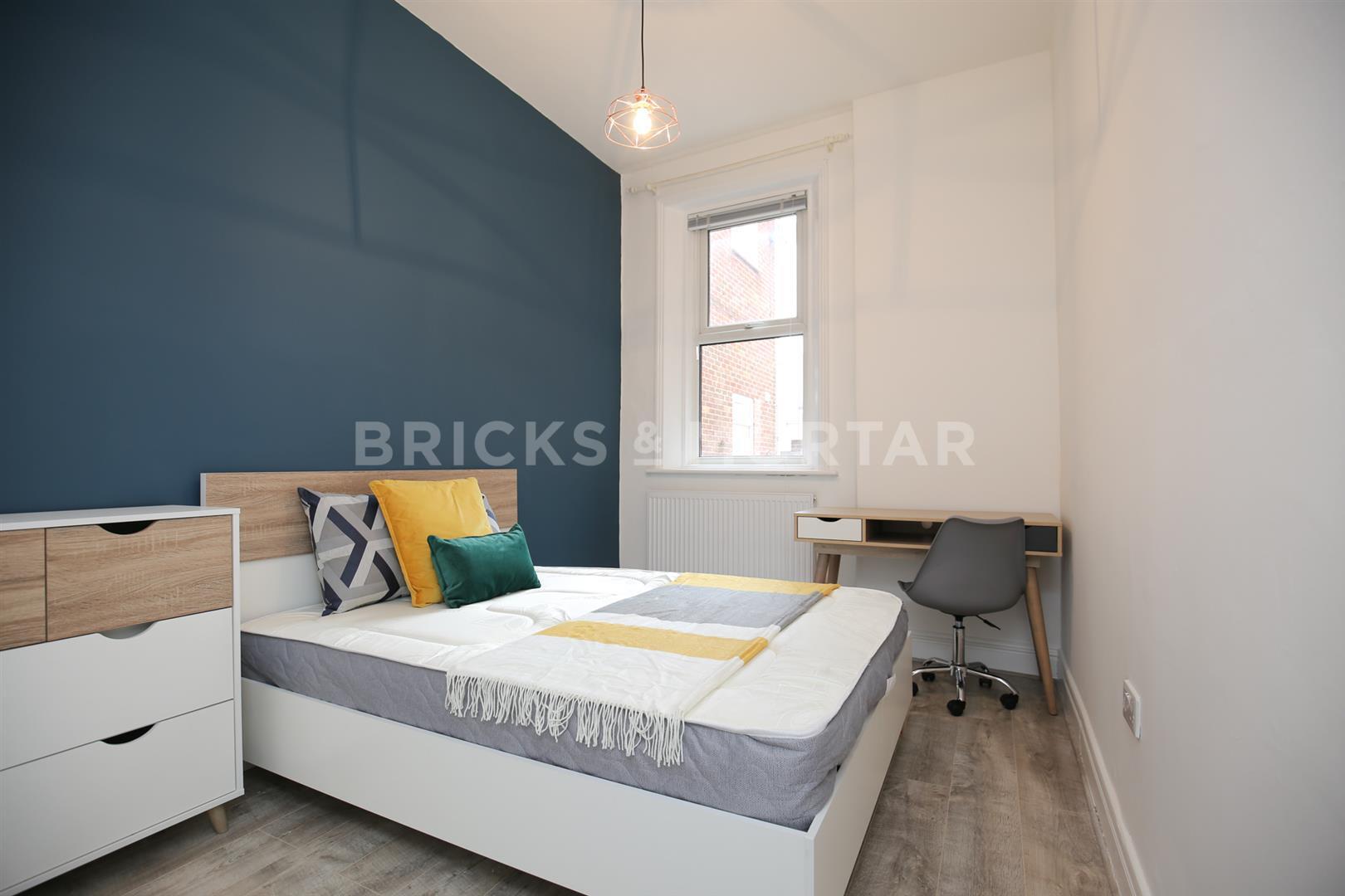 Both bedrooms are good sized doubles, including feature blue wall, double bed, desk, chair, drawers and wardrobe. Additionally, the bathroom to the rear is larger than average for a flat of this location with a separate corner bath, large corner shower cubicle, designer grey radiator, WC and sink with vanity unit and large wall mounted mirror.