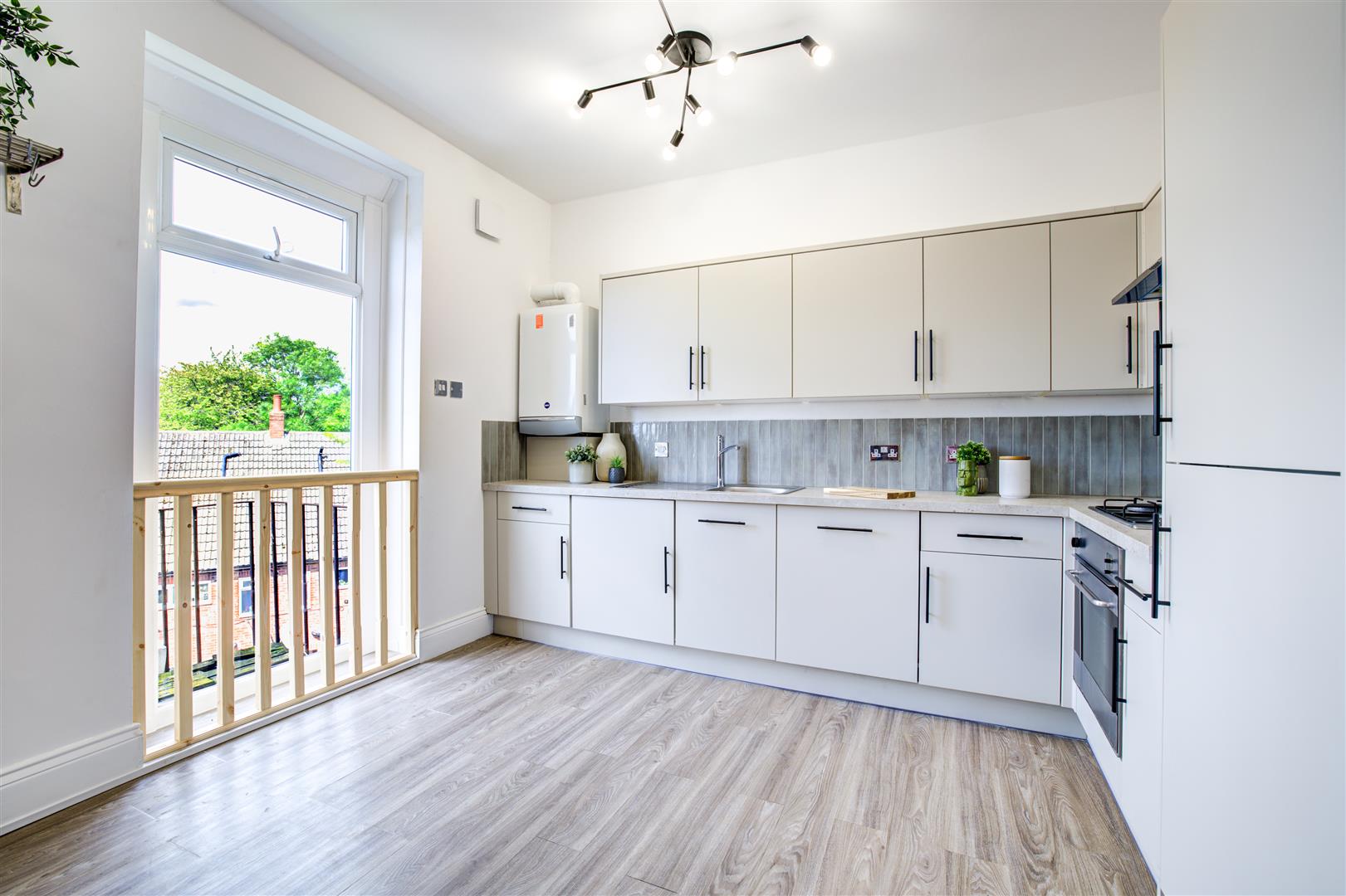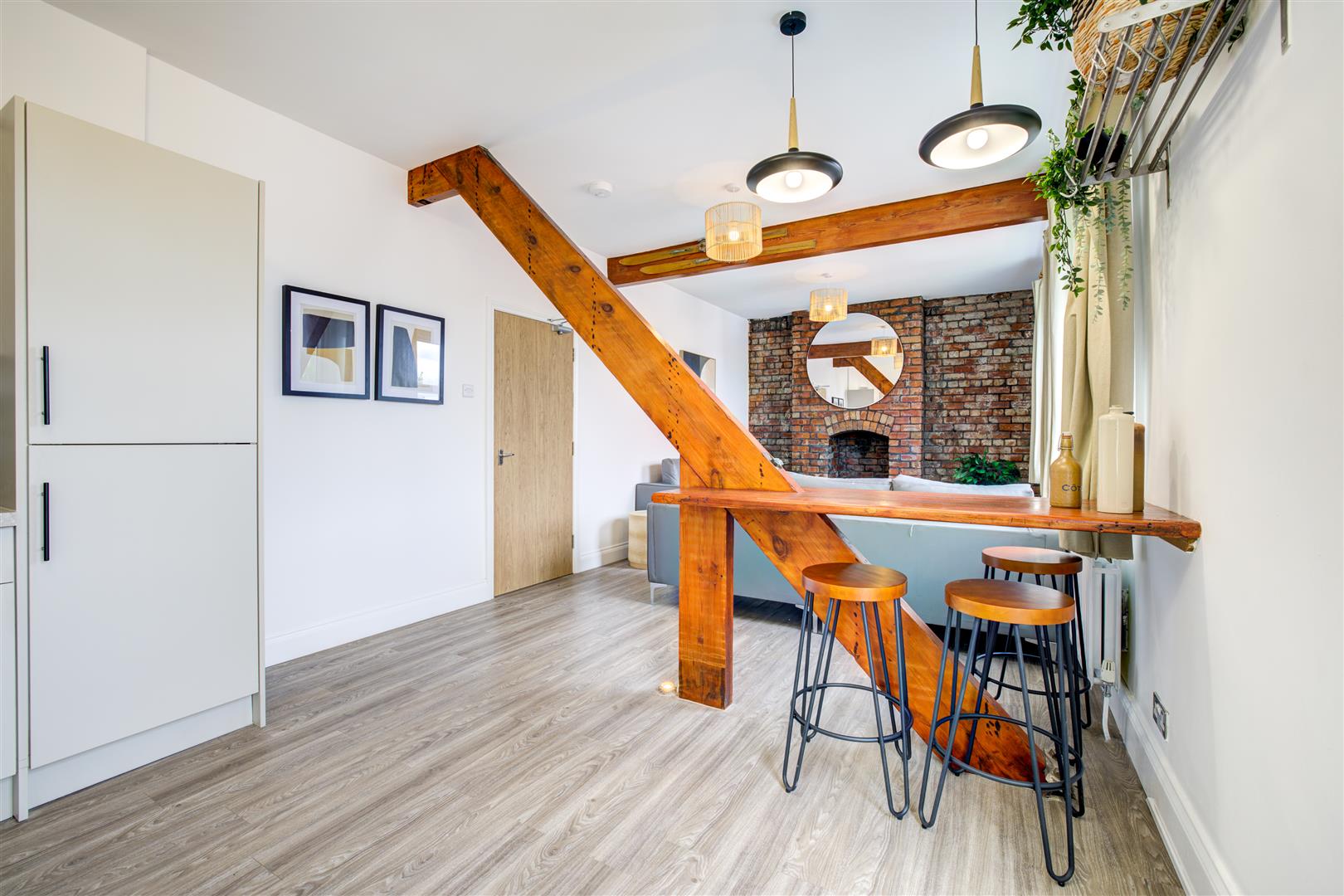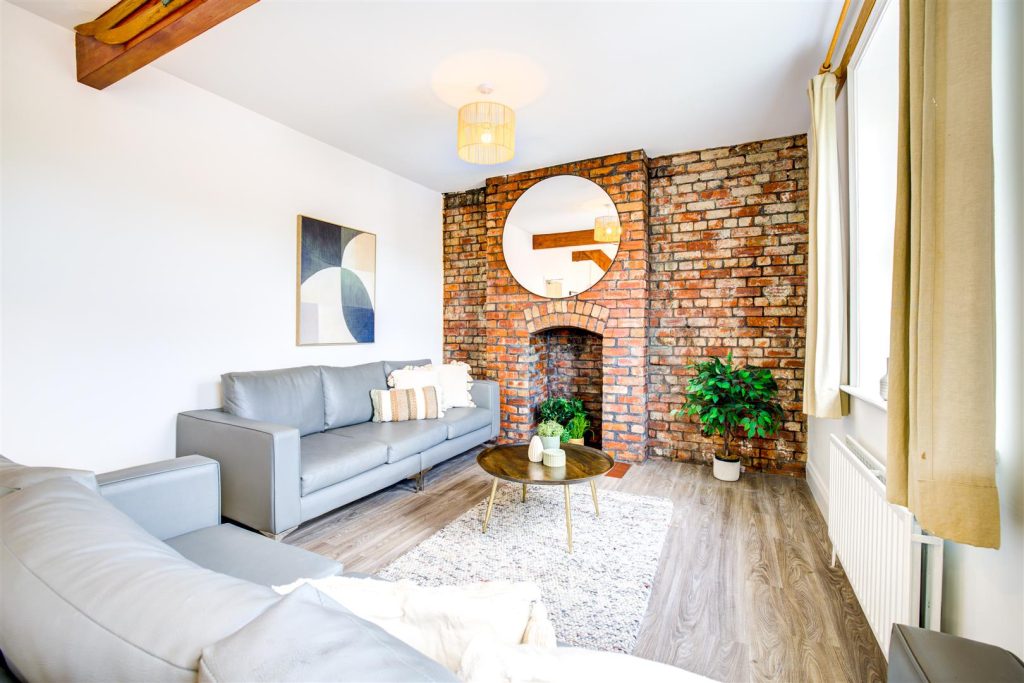 This property has been renovated in it's entirety with new decoration and flooring throughout. The living room and kitchen are open plan with a stunning island, integrated oven, sleek worktops and cupboards and integrated appliances. To the living space you'll find acoustic panelling, patio doors leading to the garden, sofa, chair, coffee table and unit with exposed feature brickwork.