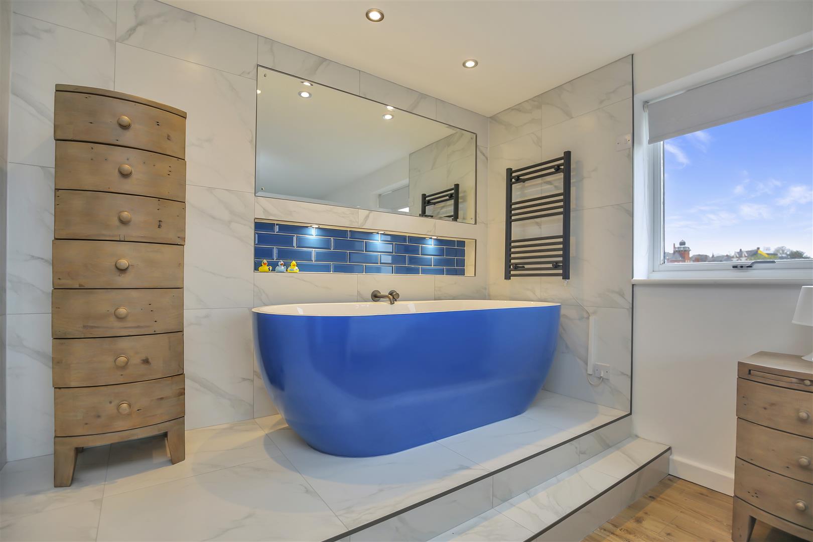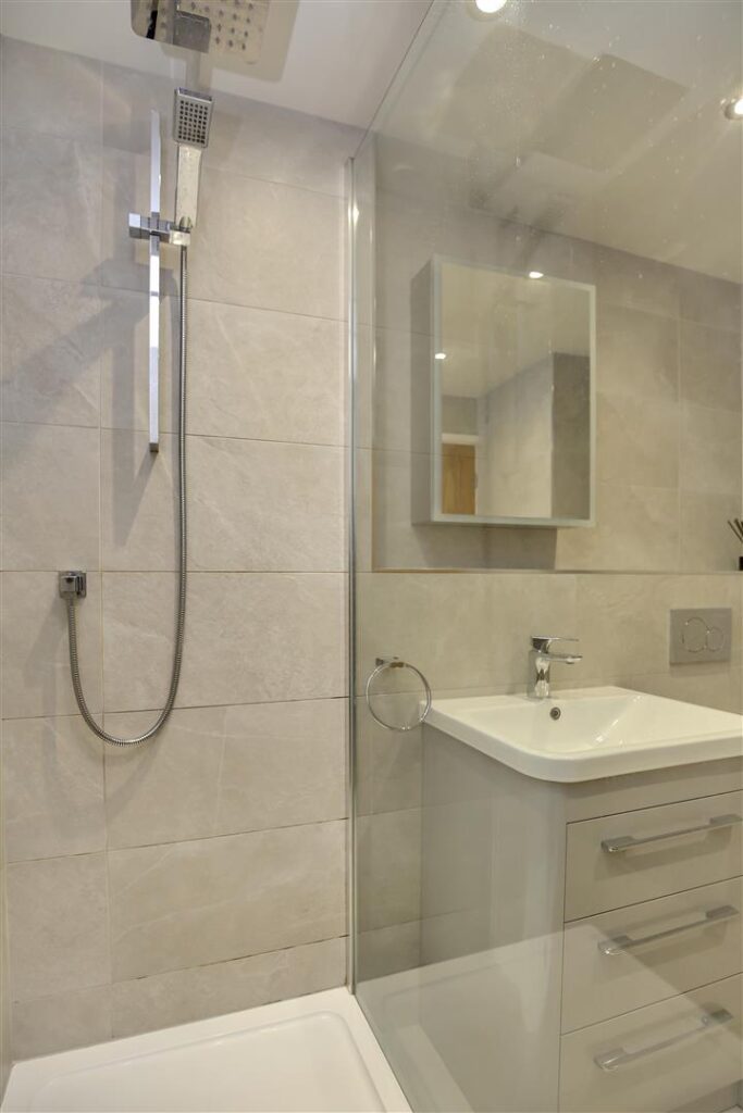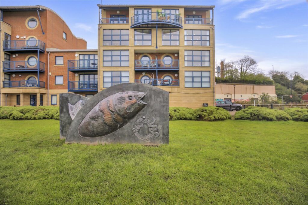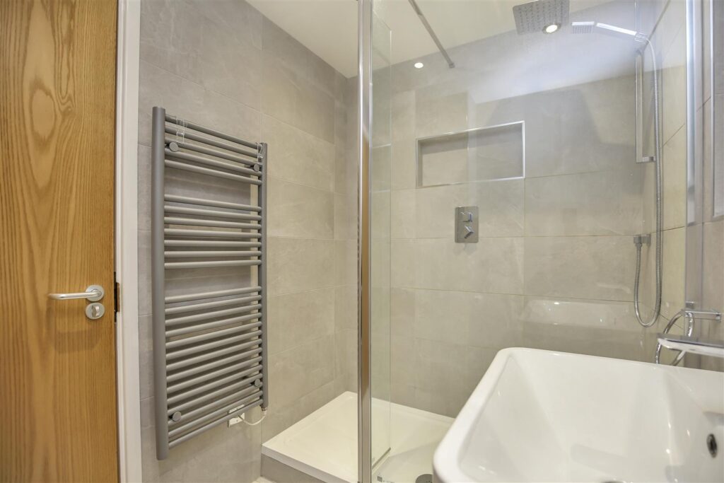 The kitchen is bright and spacious, integrated appliances include, fridge/freezer, dishwasher, washing machine, electric hob and built in over. Tiled splashbacks and under-cabinet lighting enhance the aesthetic, with double glazed window overlooking the river.