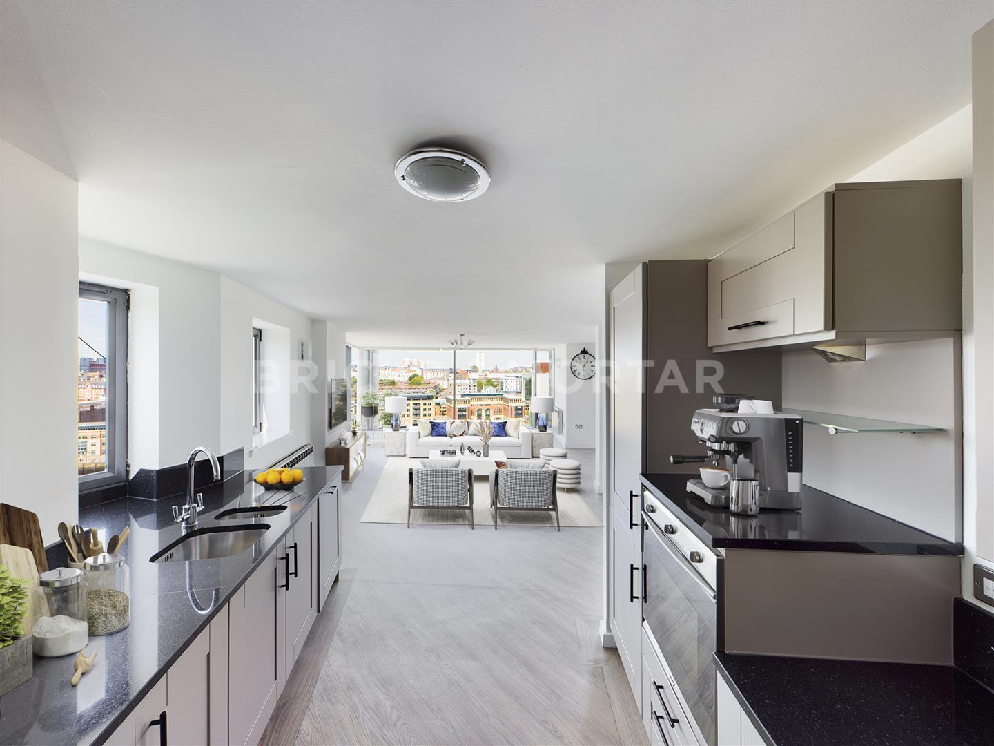 With views from multi-aspects, this is a rare chance to buy such an incredible space. The living area is perfect for entertaining as it is open-plan. There is a contemporary Charleston Grey shaker-style kitchen with wall and base units, black marble worktops and upstands, integral goods including a fridge freezer, washing machine, dishwasher, electric oven and hob with stainless steel extractor hood and splashback.