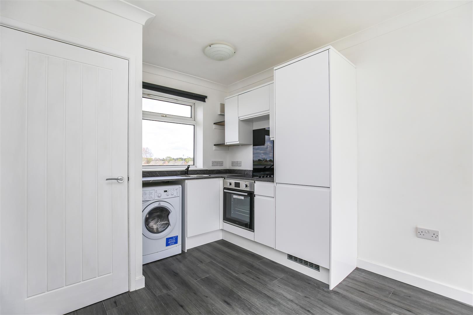 The living room and kitchen are open plan with windows either side for extra natural light. The corner aspect kitchen has been fitted with sleek white gloss units with an integrated fridge freezer, oven, ceramic hob and washing machine for the essential white goods.