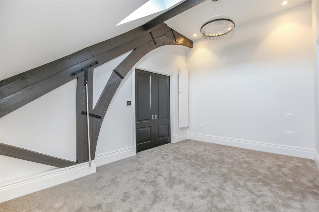 The master bedroom suite has features amazing beams and another shower room.