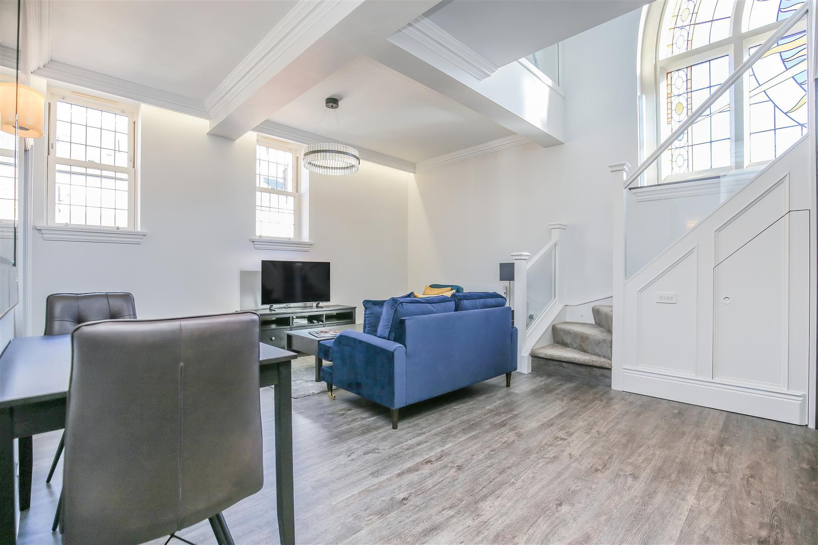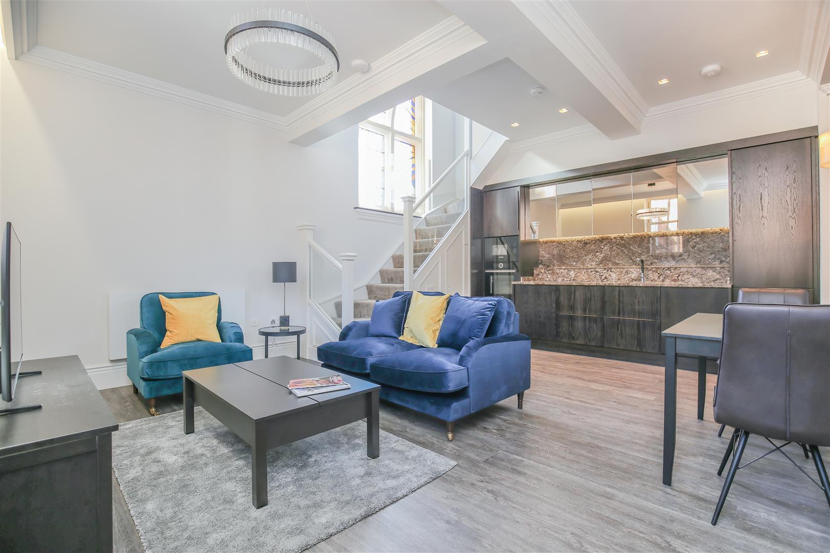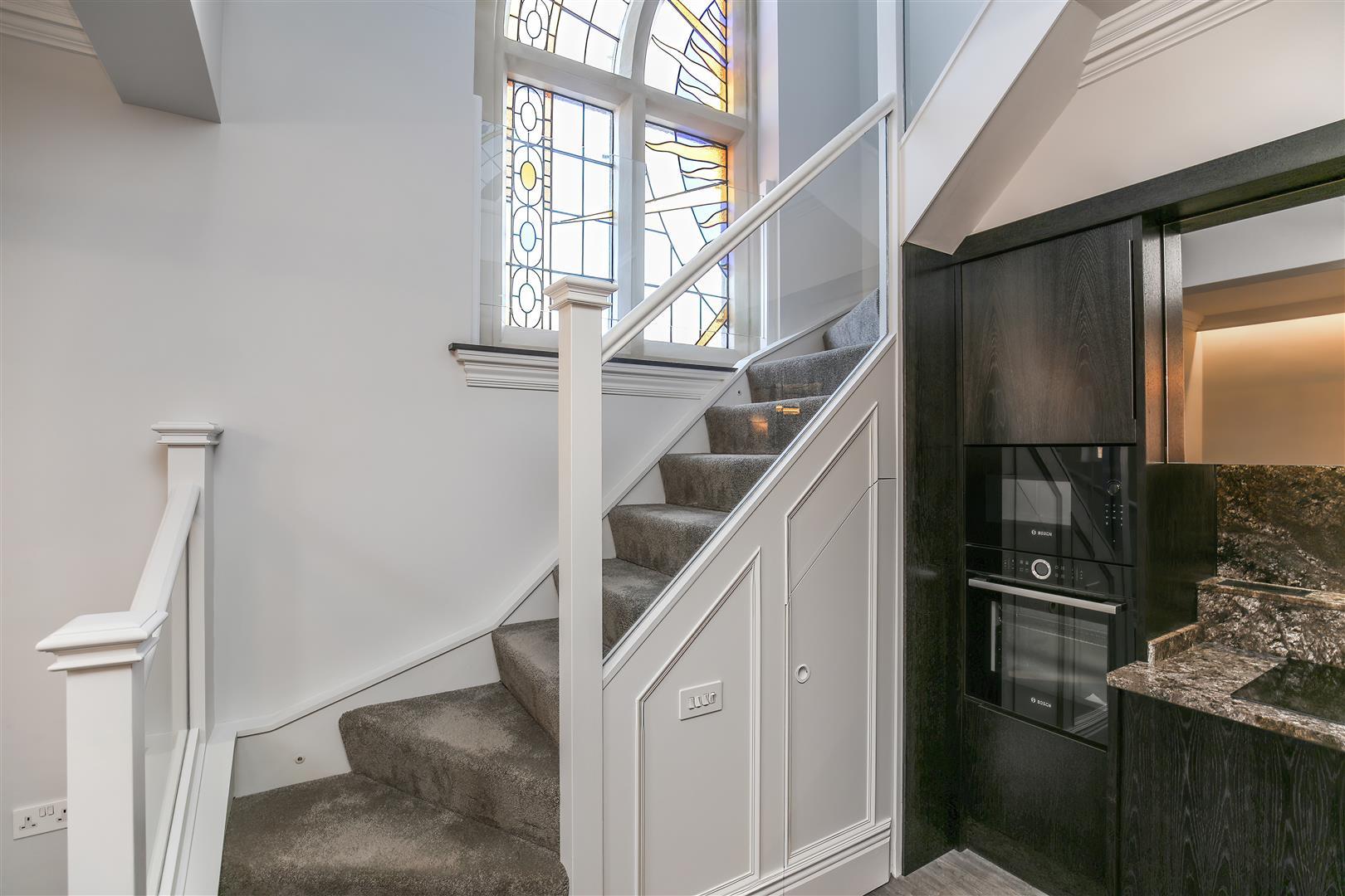 The lighting through the whole apartment has amazing detail and creates a variety of moods from the inset ceiling lights, spotlights to the stairs to the designer light fittings. For that extra element of slickness, the oven has been integrated and at mid-level height.