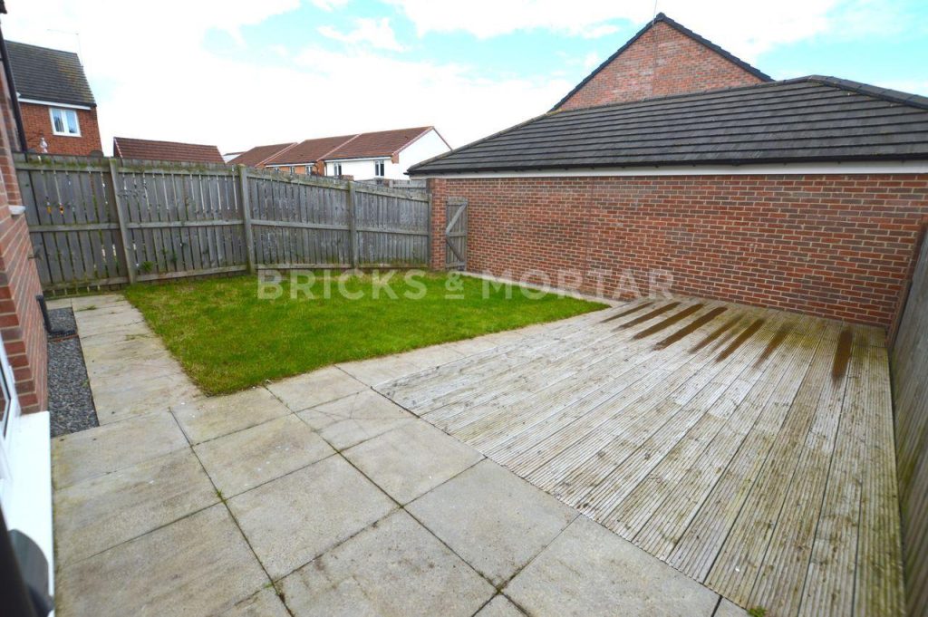 • Front town garden, rear garden with decked area and lawn, single garage, and allocated parking space