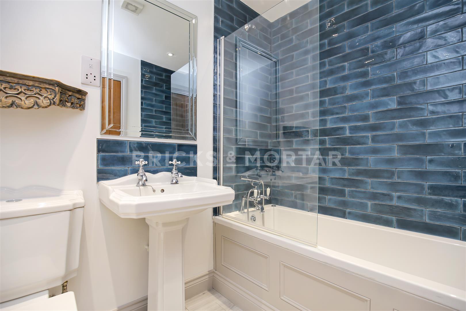 The family bathroom includes a bath, pedestal sink, over bath shower and toilet with stylish tiling.