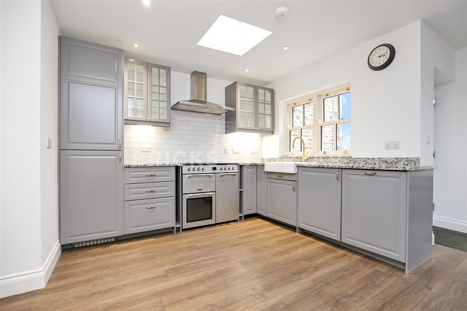 The living space is all open plan with a gorgeous open fireplace with log burner and stone surround, plush sofa, exposed beams with ornate ceiling light fitting, dining area with patio doors leading our and contemporary kitchen with ornate marble worktops and ceramic sink.