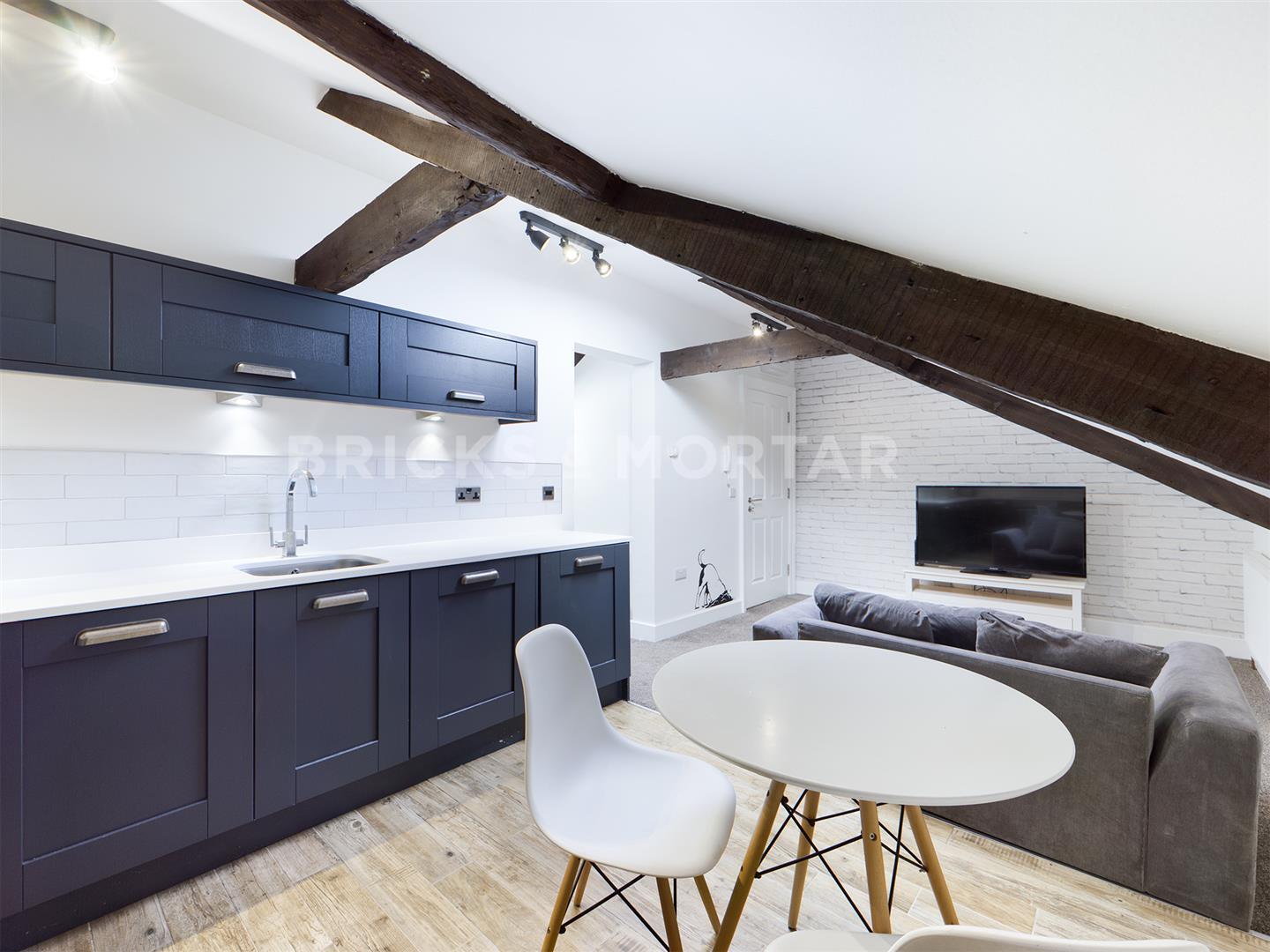 AVAILABLE MAY 2026 - Bricks & Mortar are pleased to present this charming one-bedroom studio flat on St. James Street, in the heart of Newcastle upon Tyne. The property features an open-plan kitchen and living area with stylish, contemporary décor and exposed wooden beams, creating a bright and characterful space.